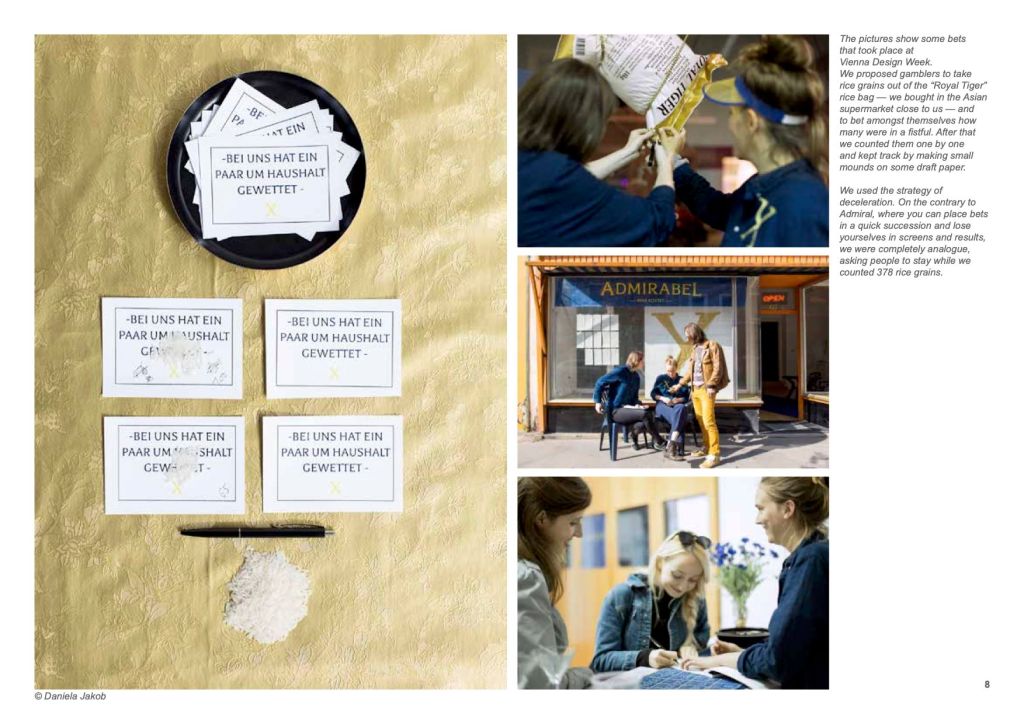 For example, we suggested to the players that they take grains of rice from the “Royal Tiger” rice bag – which we had bought in an Asian supermarket near us – and bet among themselves how many grains were in one hand. We then counted the grains one by one – a strategy for slowing down. Unlike Admiral, where you can place bets in quick succession and get lost in screens and results, we were completely analog and asked people to stay while we counted 378 grains of rice.